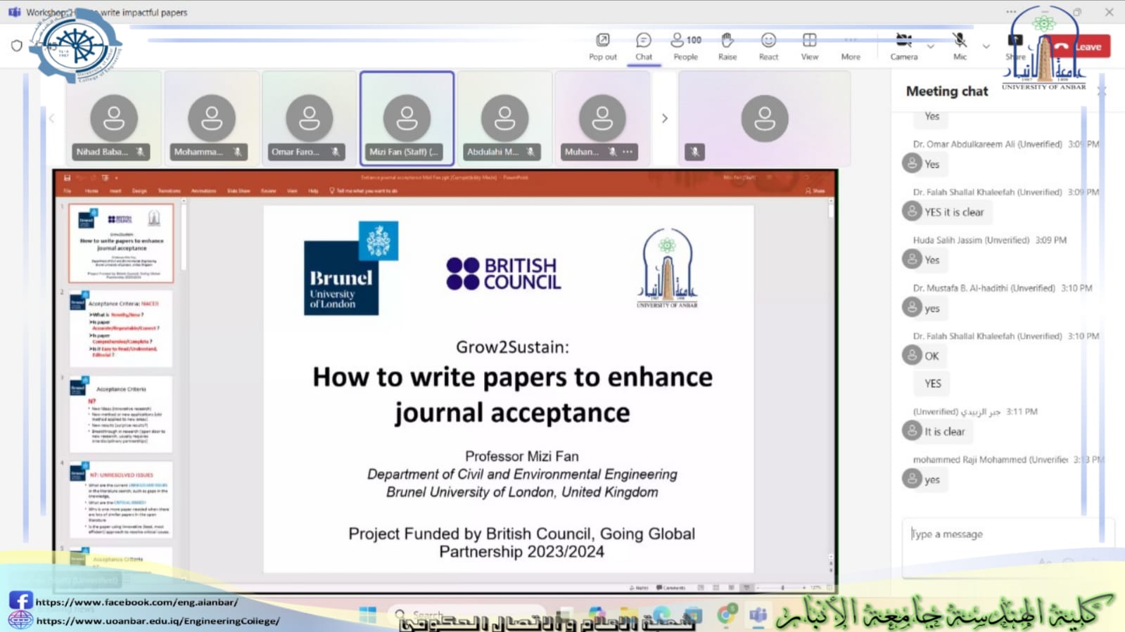 ضمن أنشطة التعاون الأكاديمي العالمي، نظّم قسم الهندسة المدنية – كلية الهندسة في جامعة الأنبار، وبالتعاون مع جامعة برونيل لندن، يوم الخميس الموافق 26 حزيران 2025، ورشة عمل علمية بعنوان: