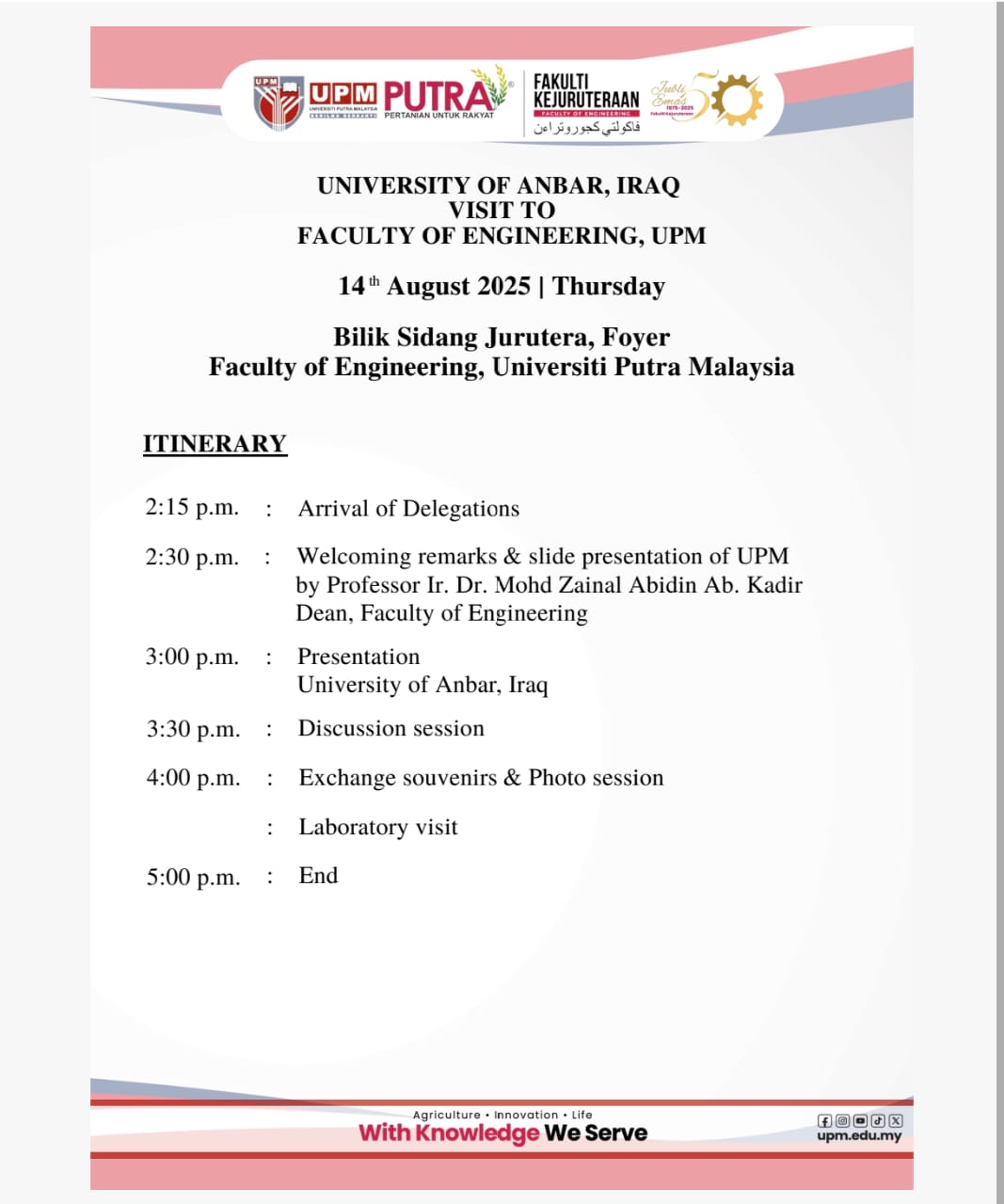 ضمن برنامج الفريق البحثي الموفد من قبل كلية الهندسة جامعة الانبار لزيارة وتفعيل التعاون العلمي والبحثي مع الجامعات الماليزية، زار الفريق البحثي اليوم الخميس 148 كلية الهندسة جامعة UPM الماليزية واجتمع مع عميد كلية الهندسة و معاوني العمداء ومسؤولي الاقسام العلمية في الكلية .