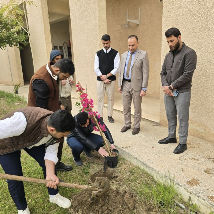 الادارية الأستاذ الدكتور عبد الباسط جاسم محمد المحترم ومعاون العميد للشؤون الإدارية الأستاذ المساعد الدكتور أحمد أنيس أحمد المحترم وبمشاركة عدد من موظفي الكلية وطلبتها، حيث جرى غرس مجموعة من الشتلات والأشجار في عدد من مواقع الكلية، في خطوة تهدف إلى إضفاء منظر جمالي وتحسين البيئة الجامعية.